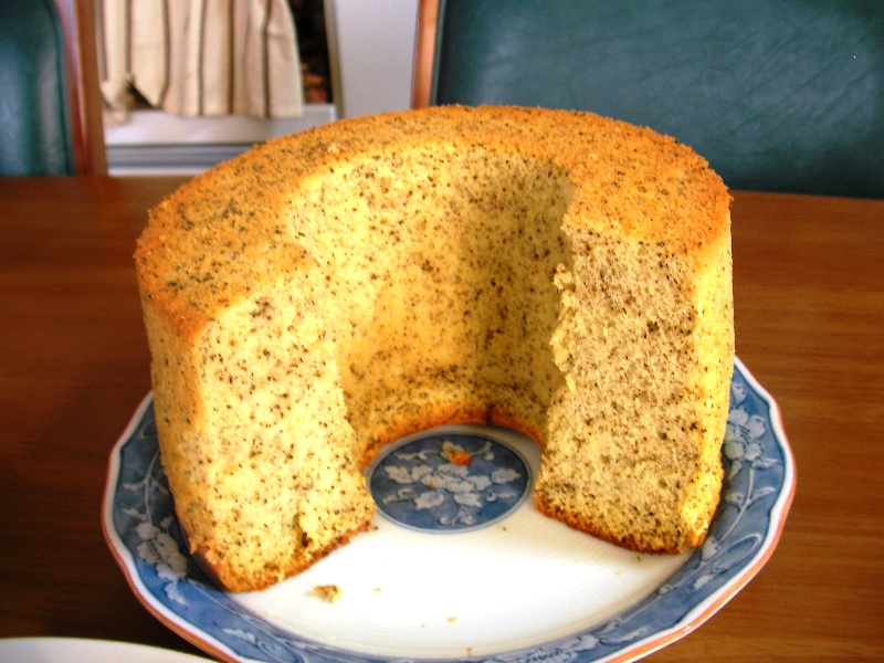 最初は、普通のシフォンケーキの分量で、全卵を共立てにして作ってみたのですが、玉砕しました。食べられないものではありませんでしたが、膨らみが半分くらいで、食感もイマイチ・・・・・というか、シフォンというものではなかったです。