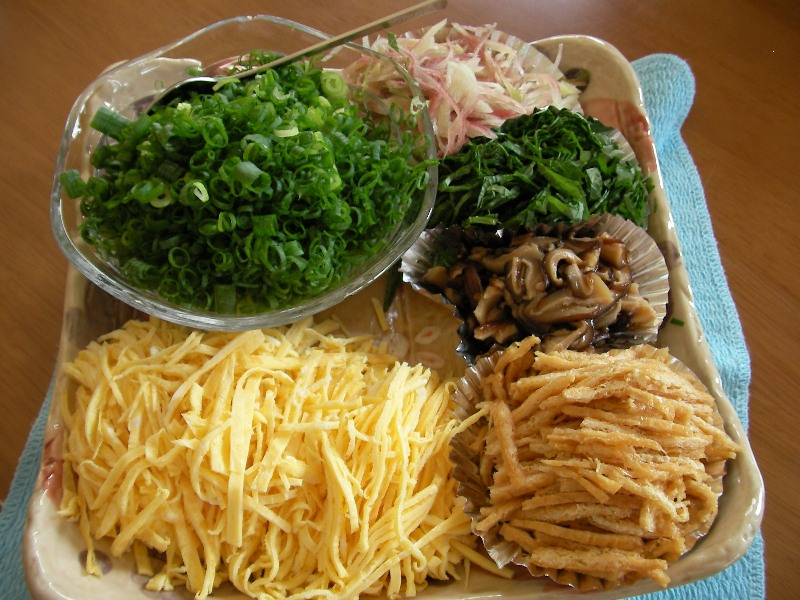 昨日は、ネギ、大葉、みょうが、金糸卵、しいたけ、あげを用意しました。あげは、デイキャンプのときに婦人会の方から教えてもらったのですが、市販されているいなりずし用のあげを細かく切っただけで、とても簡単。一度に全部は使わないので、残った分は冷凍しています。