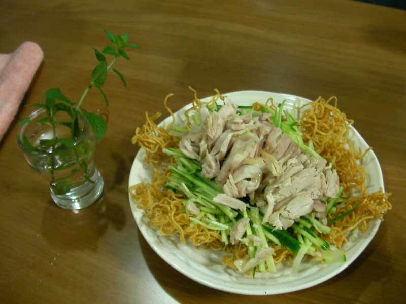 麺1袋を油でカリッとするまで揚げて、油をしっかりとったら皿に盛り、その上に千切りのきゅうりとレンジでチンした鶏肉を切ったものを乗せただけの簡単なものです。