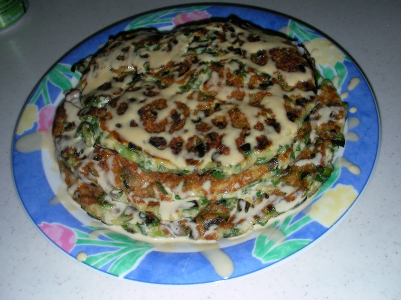 焼いたものを重ねて、マヨネーズとポン酢を同量で混ぜたものを上から掛けています。お好みソースでもいいと思いますが、うちではあまりソースは使わいません。